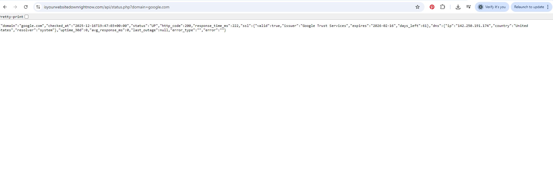 To support these use cases, IsYourWebsiteDownRightNow exposes a public API endpoint that returns real-time status information in JSON format.