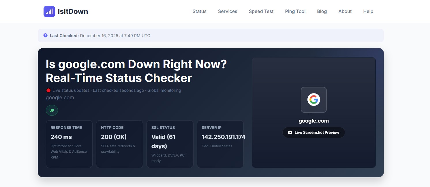 IsYourWebsiteDownRightNow performs live checks, on demand, with transparent logic.